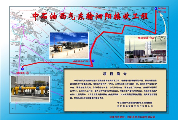 泗陽天然氣項目三期工程即中石油西氣東輸泗陽接收工程,是經(jīng)省發(fā)改委批準立項、省住建廳批準建設的項目,是泗陽縣委、縣政府2010年重點民生工程,項目總投資約為1.2億元。工程包括泗陽天然氣接收門站一座,城南高中壓調壓站、壓縮母站和加氣站各一座,城區(qū)高中壓調壓站加氣站各一座,高壓供氣管道15公里。工程于2010年8月15日開工,12月28日全面竣工,2011年1月28日試運行,2月28日正式分輸供氣。2011年3月19日,泗陽縣委、縣政府在榮浩集團辦公大樓前舉行了隆重的投產通氣儀式,宿遷市副市長趙深、泗陽縣委書記李榮錦等四套班子領導出席了儀式;中石油西氣東輸銷售公司總經(jīng)理助理李世泉同志也出席了投產儀式,并發(fā)表了熱情洋溢的講話。該工程投入運行后,最大日供氣量可達200余萬立方米,年最大供氣量可達6億立方米,為泗陽及周邊縣市眾多工商企業(yè)用戶提供強有力的能源保障,對加快蘇北能源結構調整、提高清潔能源比重、發(fā)展低碳經(jīng)濟、促進節(jié)能減排都將起到重要的推動作用。